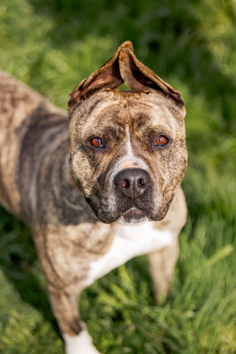 Saya est une American Bully x Bouledogue Americain de presque 7 ans (diagnose ok, chienne non catégorisée) qui est arrivée chez nous suite à une fugue. Son propriétaire a préféré la laisser au refuge.