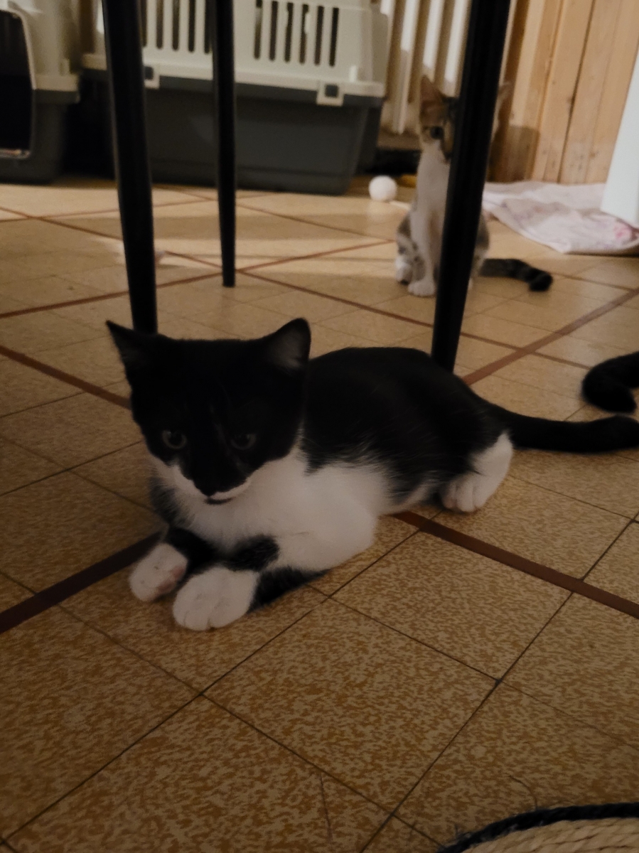 Moi c’est Pompon, je suis un chaton noir en blanc au poil mi-long, je suis aussi très craintif, l’humain me fais un peu peur, mais avec beaucoup de patience et d’amour je progresse.