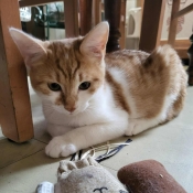 Max est un chaton adorable. Débordant d'amours. Un petit tigrée roux et blanc avec un queue de raton laveur, il est beau. Ronronne à souhait. Il aime les câlins et en donne sans réserve.