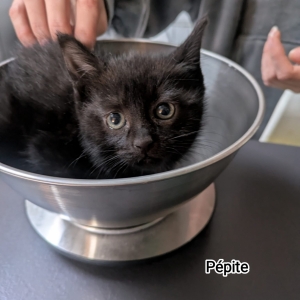 Pépite est une jolie Chatonne noire craintive mais jamais agressive. Elle aura besoin de temps pour prendre confiance et s’épanouir, et l’idéal serait un foyer avec un autre chat sociable pour l’aider à se sentir en sécurité.