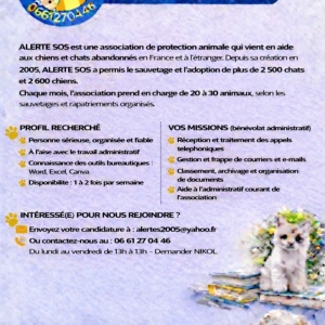 Alerte SOS, une association pour protection des chats et des chiens, cherche une aide pour le gestion administratif.