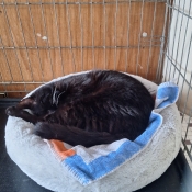 Au refuge, il se repose, il est très gourmand et toujours en demande de caresses.