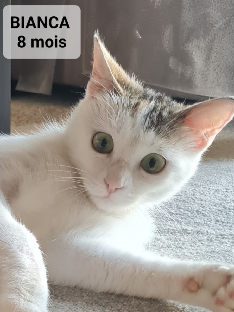 Elle ronronne beaucoup. Abandonnée par son propriétaire alors qu'elle était gestante, Bianca est un petit cœur qui aime jouer mais qui ne supporte pas la concurrence d'un autre chat ou chien !
