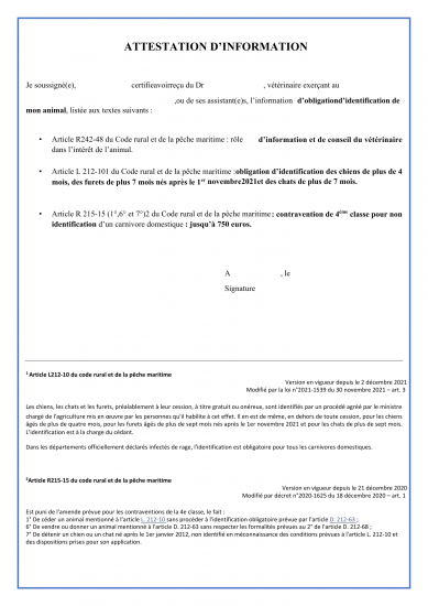 Cette attestation est bien sûr à présenter et faire signer uniquement après l’argumentaire nécessaire, sur la protection qu’assure l’identification individuelle à son animal en cas de perte ou de vol, sur la bien meilleure chance de le retrouver en cas de fugue, et bien entendu sur le respect de la loi, si la personne persiste dans son refus.