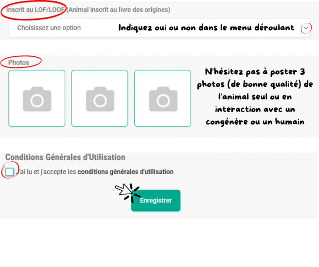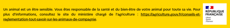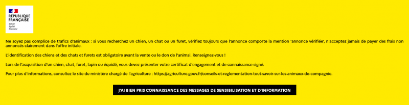Tout d'abord dès connexion à la platefome des messages de sensibilisation et d’information du détenteur concernant l’acte d’acquisition d’un animal s’affichent avant d’accéder aux annonces (message 1), puis pour chaque annonce (message 2) afin de responsabiliser les futurs détenteurs.
