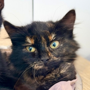 Sa belle fourrure écaille de tortue vous donnera envie de la papouiller. ne vous y trompez pas, malgré son regard de pas contente, elle aime les câlins. Elle est calme, réservée et recherche une famille douce et aimante
