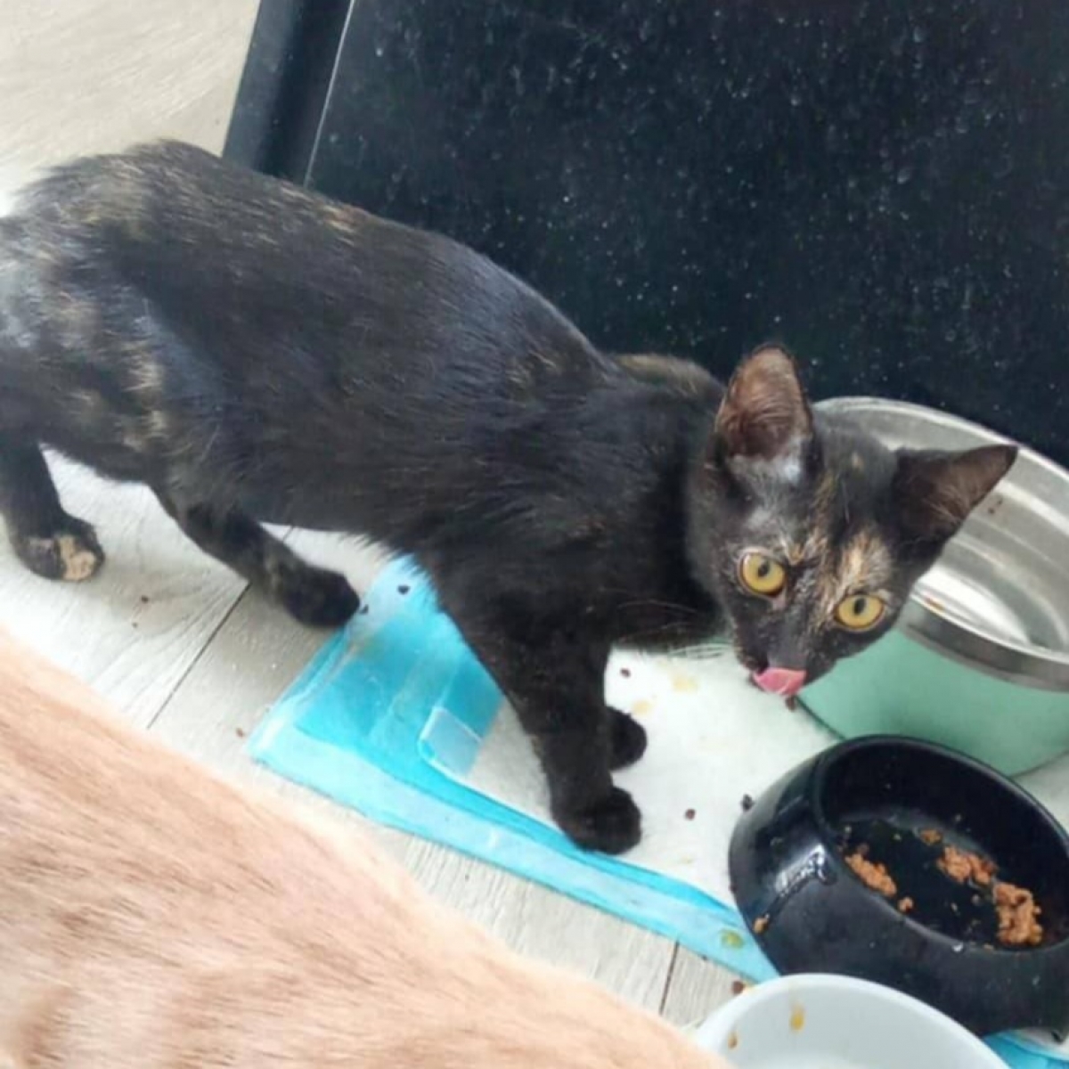 Cette pépette revient de loin et reprends du poids petit à petit. Trouvée errante sans sa maman, elle recherche énormément la compagnie des autres chats et prends tous les grands pour papa et maman. Il faudra donc un autre chat pour son bien être.