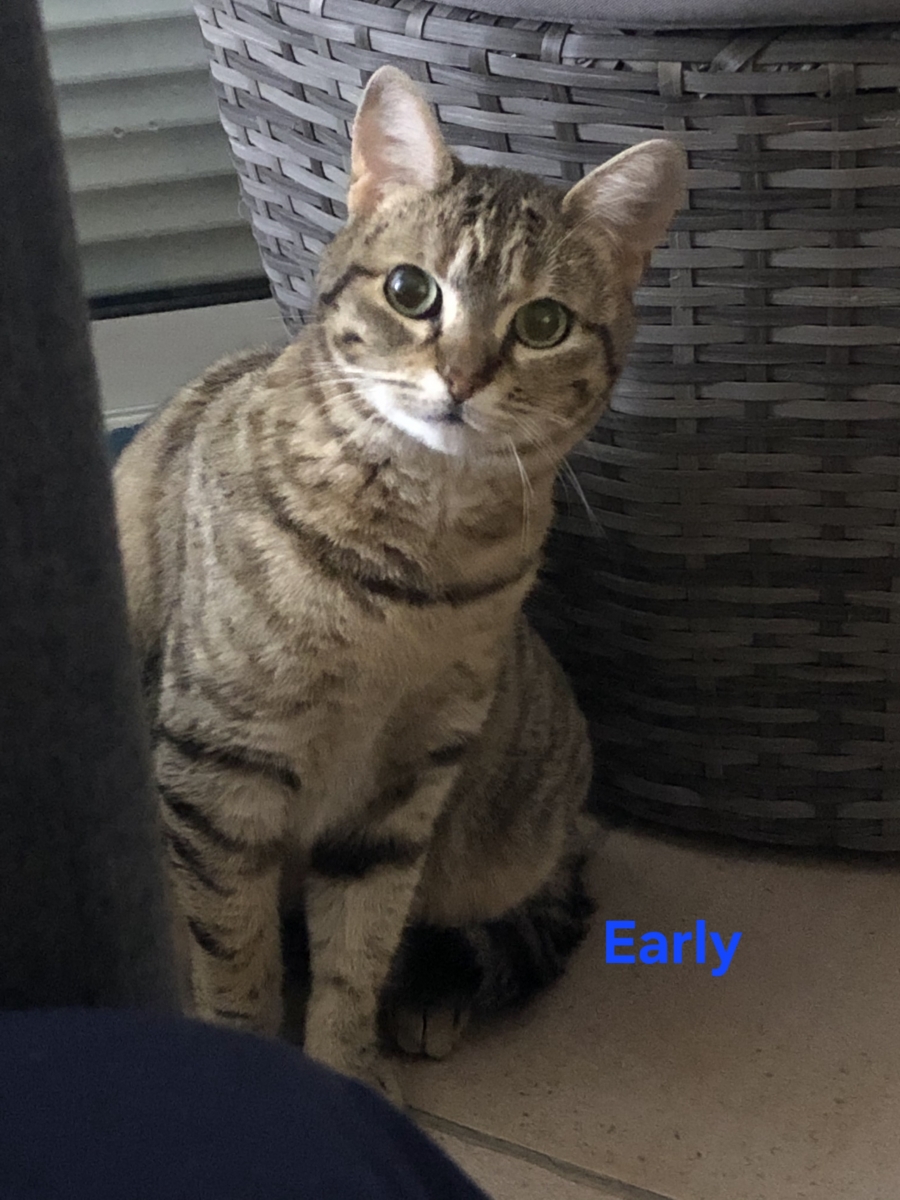 Early est une chatte recueillie errante voilà plusieurs années ; traumatisée par l'abandon, elle a un caractère un peu difficile et ne doit pas être brusquée ; elle est peureuse, anxieuse, et a besoin d'équilibre et de calme. Lorsqu'elle n'est pas stressée, elle est capable d'être câline avec un humain. Son placement est une urgence.