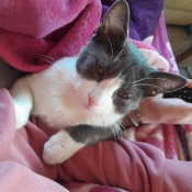 Chat aimant notre présence, les caresses à sa demande. N'aime pas être porté.