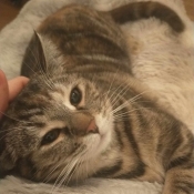 Elle reste encore craintive, elle se laisse approcher et caresser, elle est très gourmande.