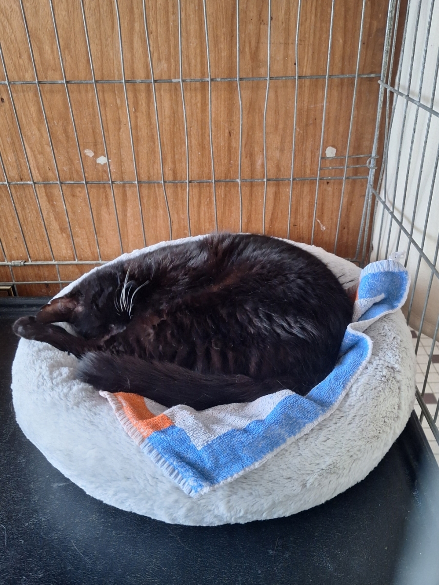 Au refuge, il se repose, il est très gourmand et toujours en demande de caresses.