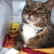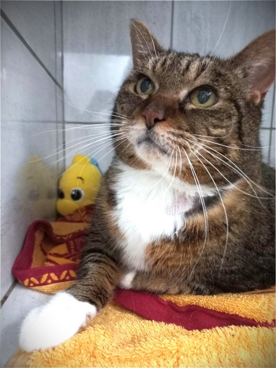 C’est une magnifique minette tigré et blanche avec un jabot blanc. Elle est ultra craquante quand elle lève ses grands yeux vers nous. Elle est très câline et elle ronronne très fort sous les caresses.